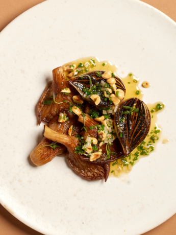 Stegte østershatte med grillede løg og brunet smør