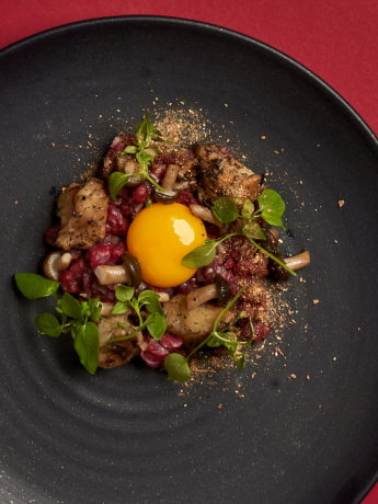 Tatar på okseinderlår med knoldselleri, svampe og rå æggeblomme